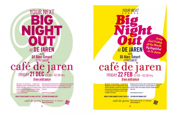 Huisstijl Voor Café de Jaren hebben we het briefpapier, de website en de bewegwijzering verzorgd. Daarnaast ontwerpen we ook speciale aankondigingen zoals voor de Big Night Out dansavonden.